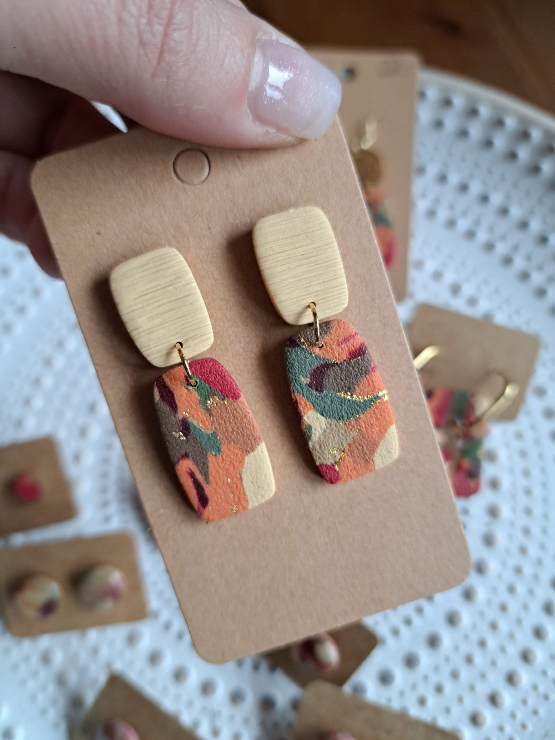 Polymerton ist eine ofenhärtende Modelliermasse die sich vor allem durch ihr leichtes Gewicht auszeichnet. Daher sind die Ohrringe sehr angenehm zu tragen und beschweren deine Ohren nicht. Nach dem Ausrollen und in Form bringen werden die Ohrringe gebacken und durchlaufen danach viele verschieden Arbeitsschritte. Einige Arbeitsschritte kannst du dir auch Hier ansehen. Manche Modelle werden nach dem Backen mit UV Harz versiegelt. Die Rückseiten der Ohrringe sind in der Regel nicht bearbeitet.