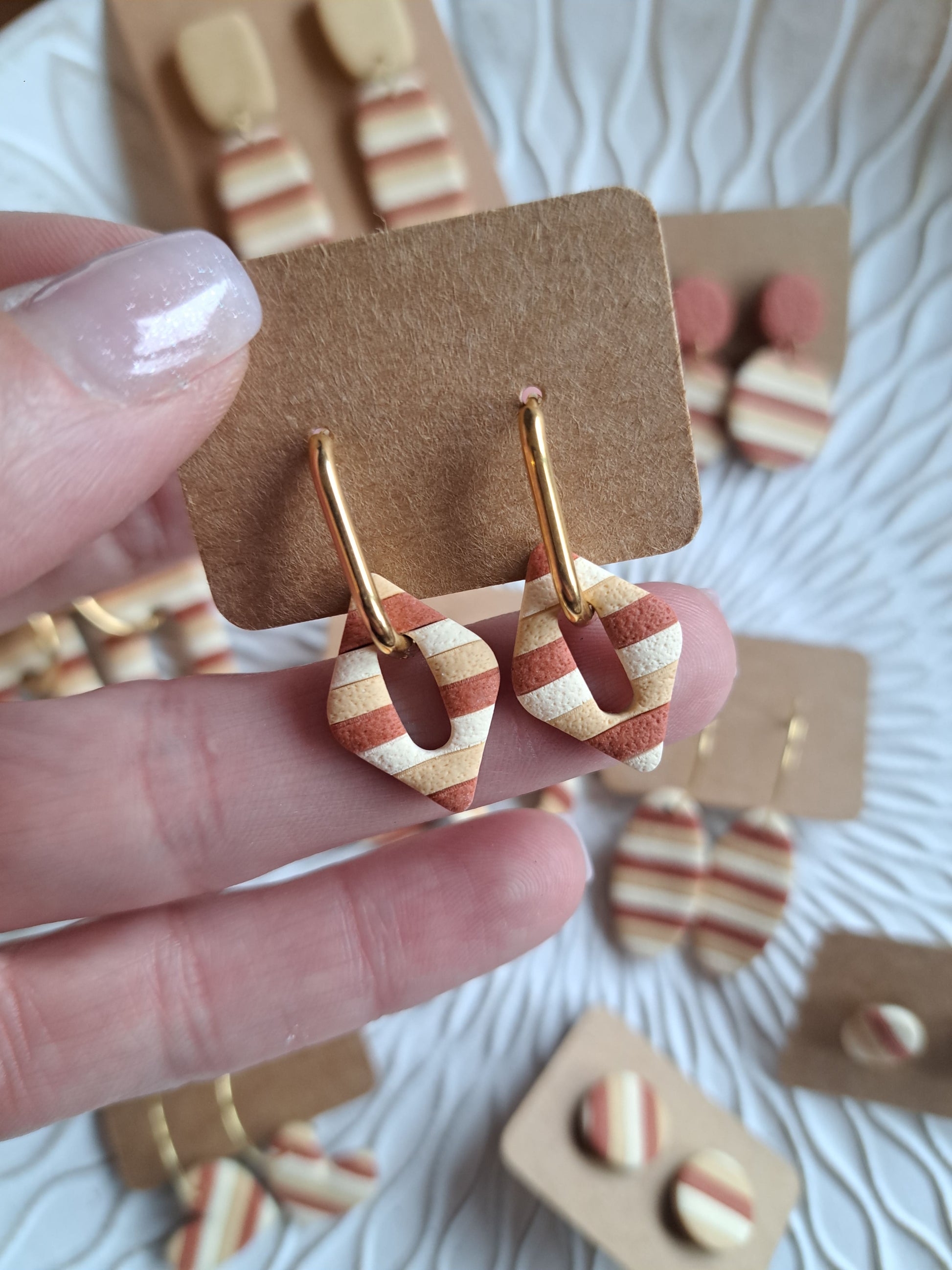Polymerton ist eine ofenhärtende Modelliermasse die sich vor allem durch ihr leichtes Gewicht auszeichnet. Daher sind die Ohrringe sehr angenehm zu tragen und beschweren deine Ohren nicht. Nach dem Ausrollen und in Form bringen werden die Ohrringe gebacken und durchlaufen danach viele verschieden Arbeitsschritte. Einige Arbeitsschritte kannst du dir auch Hier ansehen. Manche Modelle werden nach dem Backen mit UV Harz versiegelt. Die Rückseiten der Ohrringe sind in der Regel nicht bearbeitet.