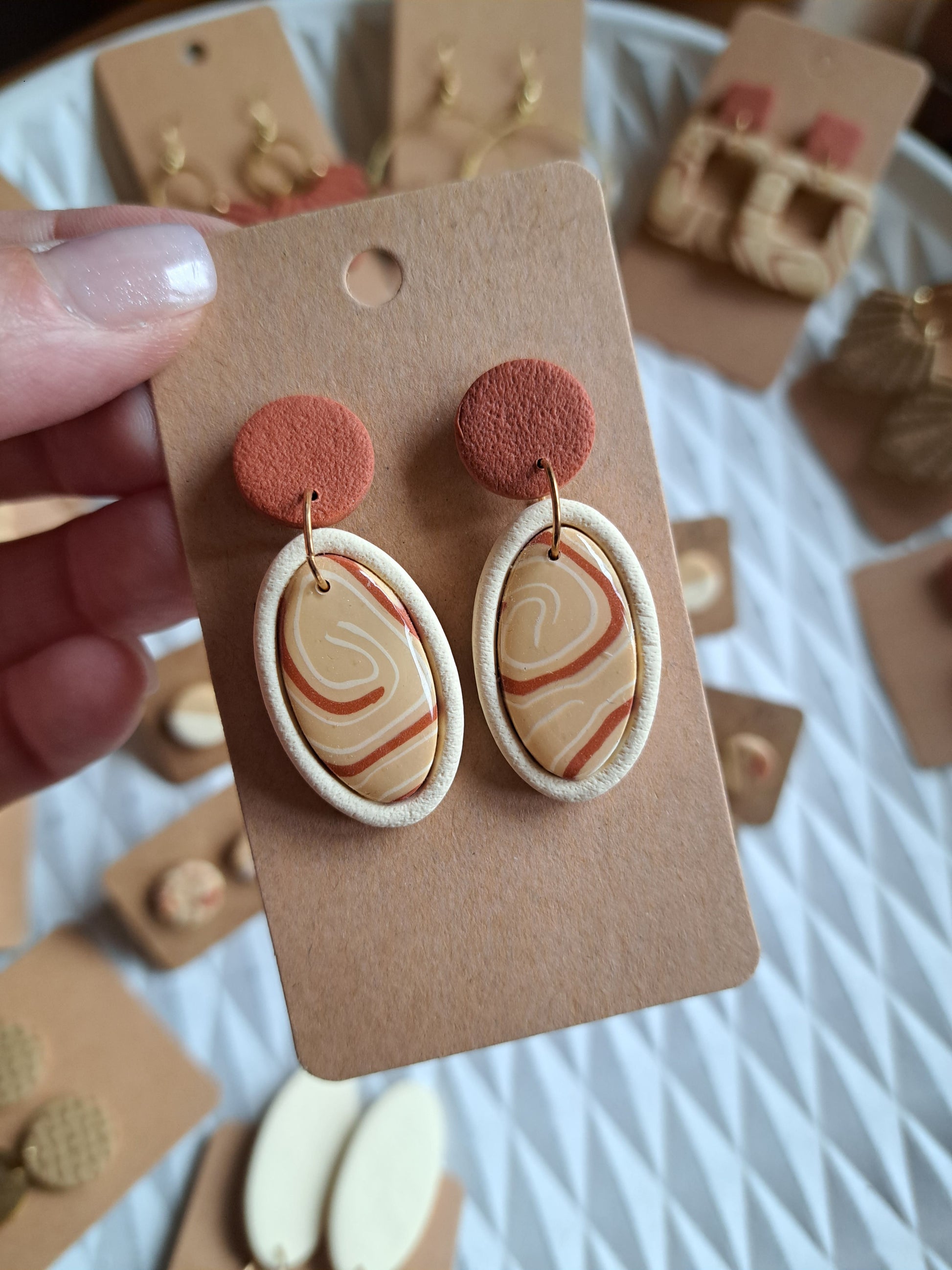 Polymerton ist eine ofenhärtende Modelliermasse die sich vor allem durch ihr leichtes Gewicht auszeichnet. Daher sind die Ohrringe sehr angenehm zu tragen und beschweren deine Ohren nicht. Nach dem Ausrollen und in Form bringen werden die Ohrringe gebacken und durchlaufen danach viele verschieden Arbeitsschritte. Einige Arbeitsschritte kannst du dir auch Hier ansehen. Manche Modelle werden nach dem Backen mit UV Harz versiegelt. Die Rückseiten der Ohrringe sind in der Regel nicht bearbeitet.