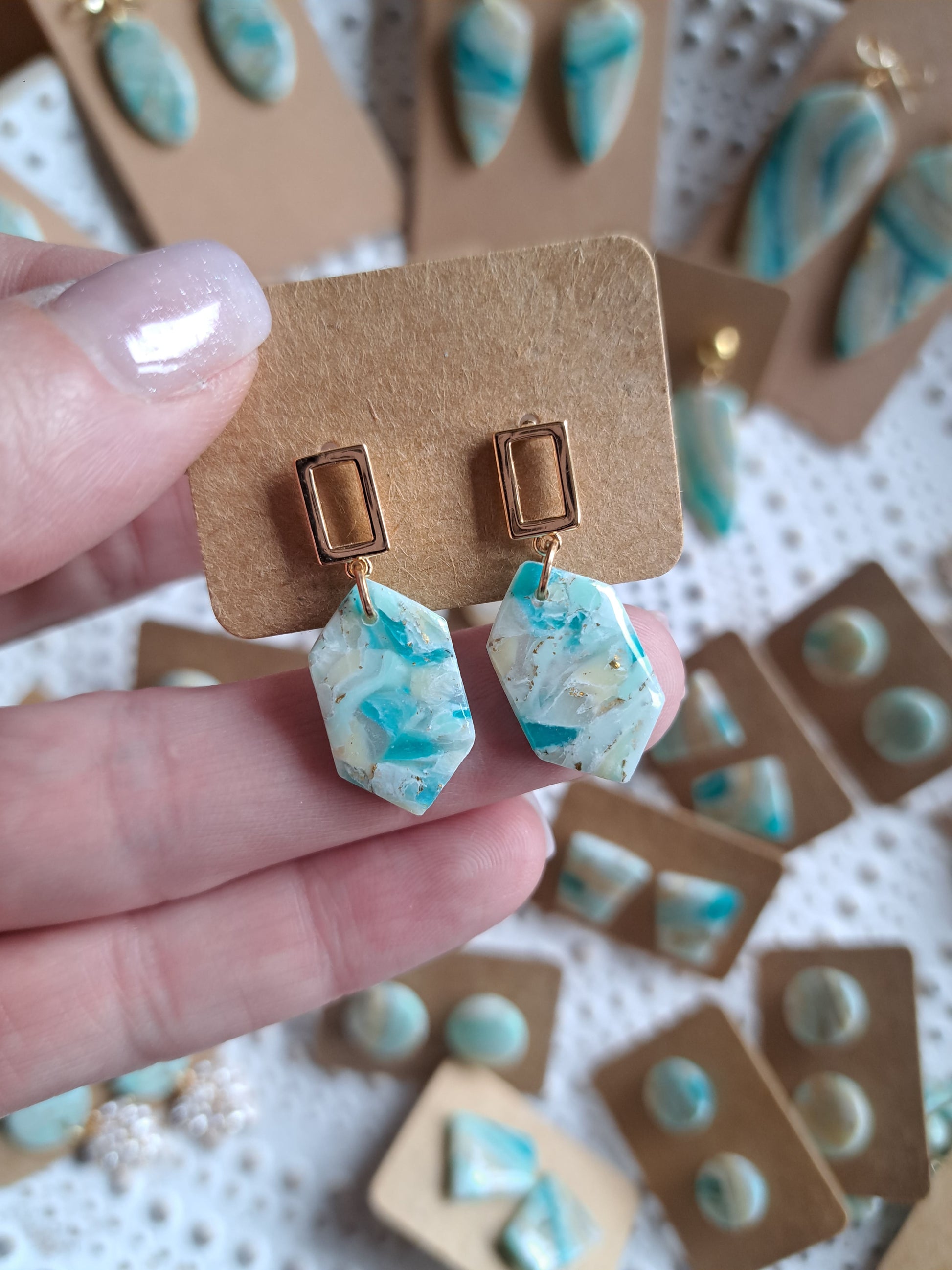 Polymerton ist eine ofenhärtende Modelliermasse die sich vor allem durch ihr leichtes Gewicht auszeichnet. Daher sind die Ohrringe sehr angenehm zu tragen und beschweren deine Ohren nicht. Nach dem Ausrollen und in Form bringen werden die Ohrringe gebacken und durchlaufen danach viele verschieden Arbeitsschritte. Einige Arbeitsschritte kannst du dir auch Hier ansehen. Manche Modelle werden nach dem Backen mit UV Harz versiegelt. Die Rückseiten der Ohrringe sind in der Regel nicht bearbeitet.