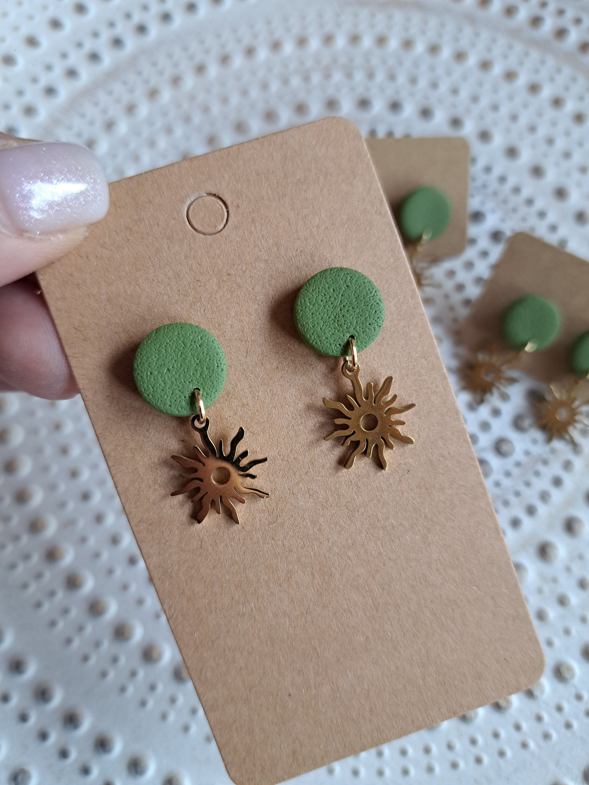 Polymerton ist eine ofenhärtende Modelliermasse die sich vor allem durch ihr leichtes Gewicht auszeichnet. Daher sind die Ohrringe sehr angenehm zu tragen und beschweren deine Ohren nicht. Nach dem Ausrollen und in Form bringen werden die Ohrringe gebacken und durchlaufen danach viele verschieden Arbeitsschritte. Einige Arbeitsschritte kannst du dir auch Hier ansehen. Manche Modelle werden nach dem Backen mit UV Harz versiegelt. Die Rückseiten der Ohrringe sind in der Regel nicht bearbeitet.