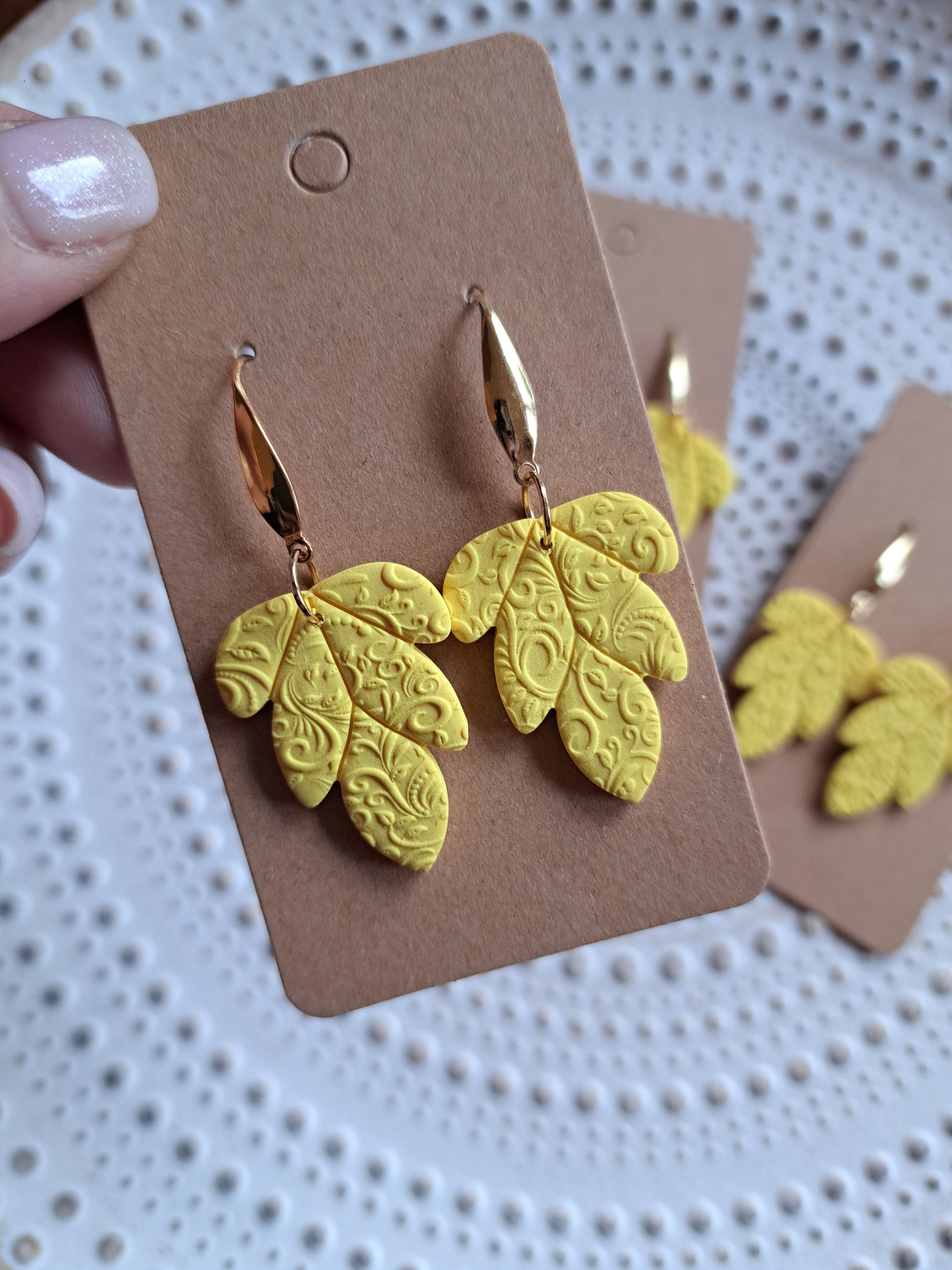 Polymerton ist eine ofenhärtende Modelliermasse die sich vor allem durch ihr leichtes Gewicht auszeichnet. Daher sind die Ohrringe sehr angenehm zu tragen und beschweren deine Ohren nicht. Nach dem Ausrollen und in Form bringen werden die Ohrringe gebacken und durchlaufen danach viele verschieden Arbeitsschritte. Einige Arbeitsschritte kannst du dir auch Hier ansehen. Manche Modelle werden nach dem Backen mit UV Harz versiegelt. Die Rückseiten der Ohrringe sind in der Regel nicht bearbeitet.