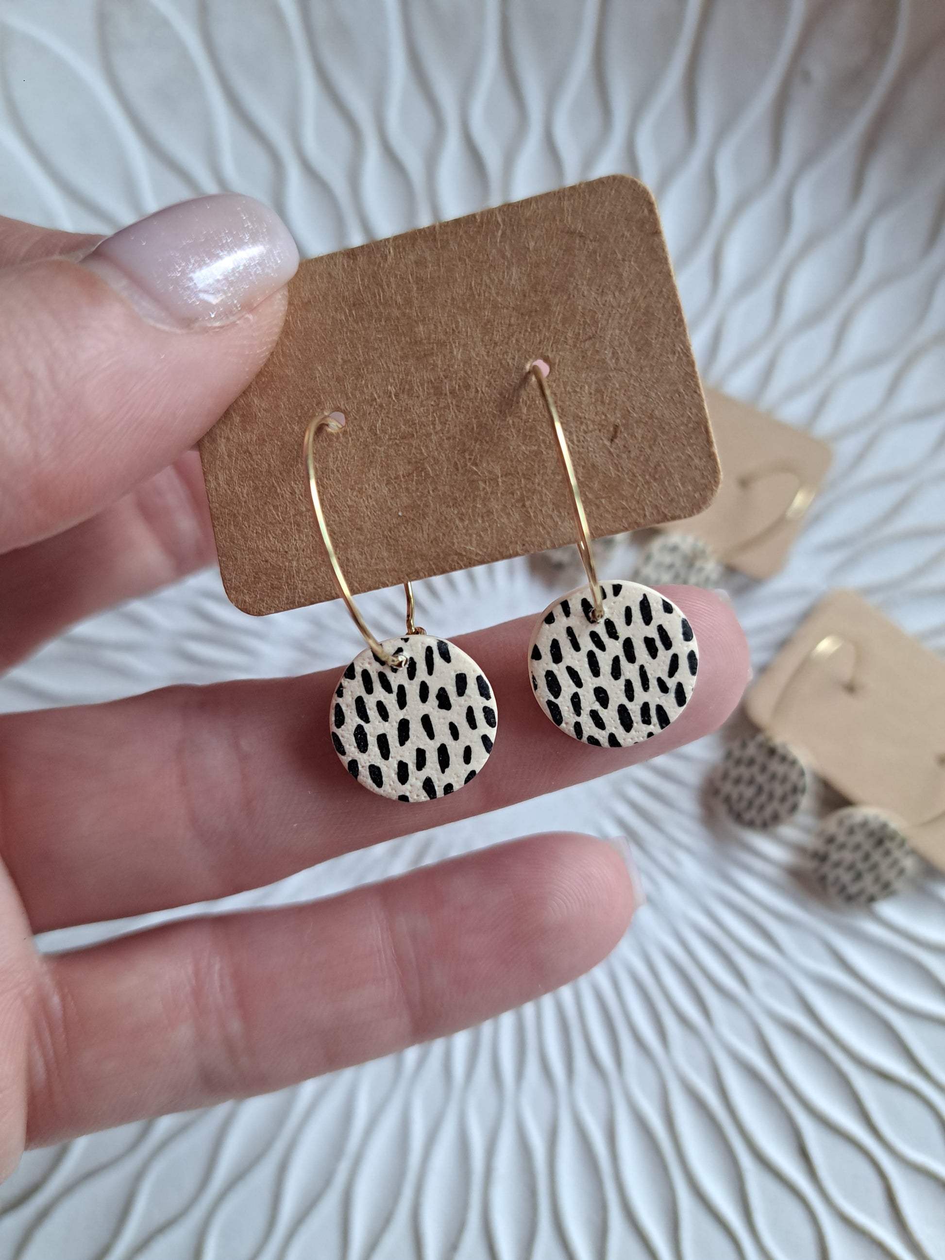 Polymerton ist eine ofenhärtende Modelliermasse die sich vor allem durch ihr leichtes Gewicht auszeichnet. Daher sind die Ohrringe sehr angenehm zu tragen und beschweren deine Ohren nicht. Nach dem Ausrollen und in Form bringen werden die Ohrringe gebacken und durchlaufen danach viele verschieden Arbeitsschritte. Einige Arbeitsschritte kannst du dir auch Hier ansehen. Manche Modelle werden nach dem Backen mit UV Harz versiegelt. Die Rückseiten der Ohrringe sind in der Regel nicht bearbeitet.