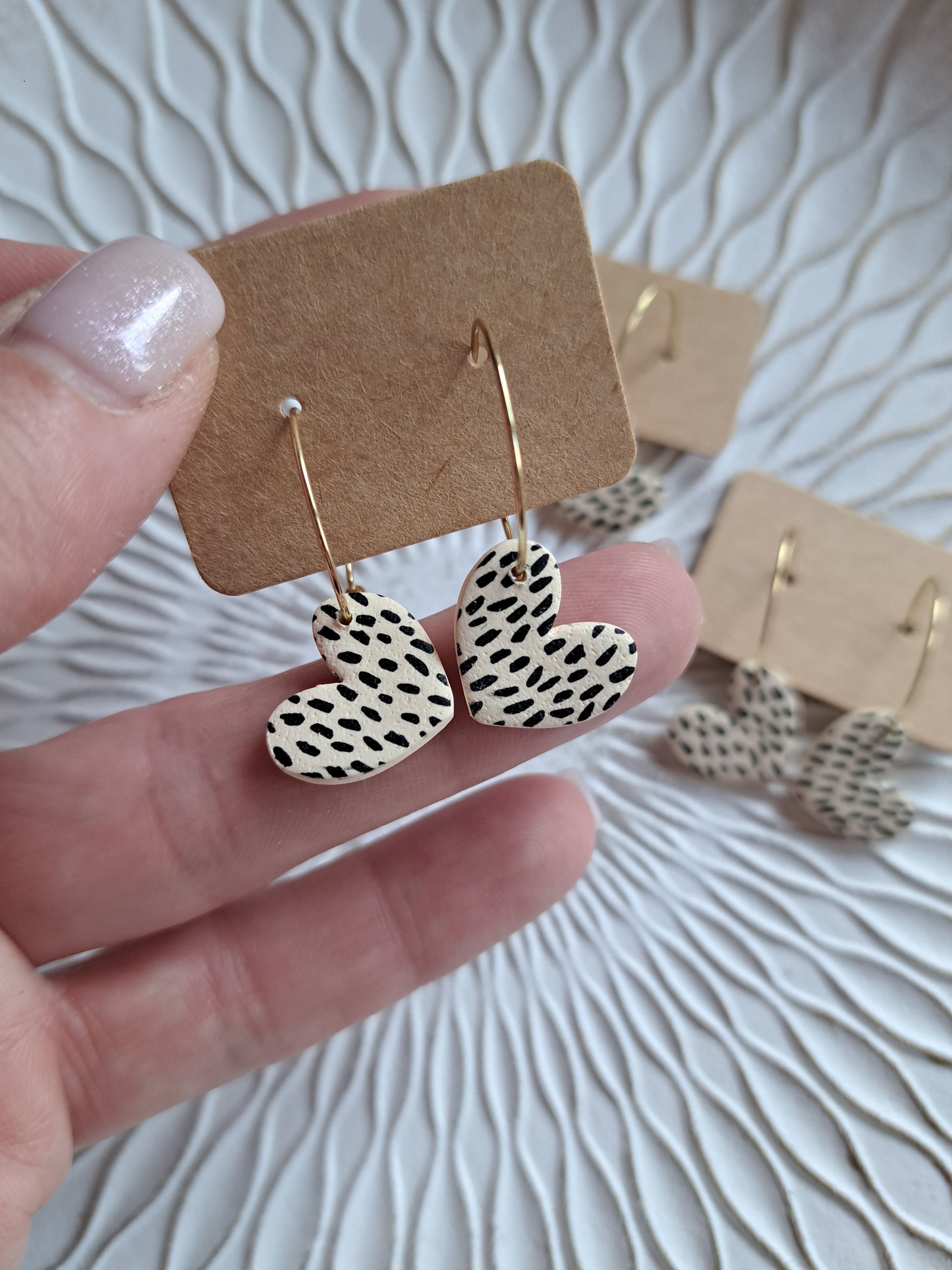 Polymerton ist eine ofenhärtende Modelliermasse die sich vor allem durch ihr leichtes Gewicht auszeichnet. Daher sind die Ohrringe sehr angenehm zu tragen und beschweren deine Ohren nicht. Nach dem Ausrollen und in Form bringen werden die Ohrringe gebacken und durchlaufen danach viele verschieden Arbeitsschritte. Einige Arbeitsschritte kannst du dir auch Hier ansehen. Manche Modelle werden nach dem Backen mit UV Harz versiegelt. Die Rückseiten der Ohrringe sind in der Regel nicht bearbeitet.