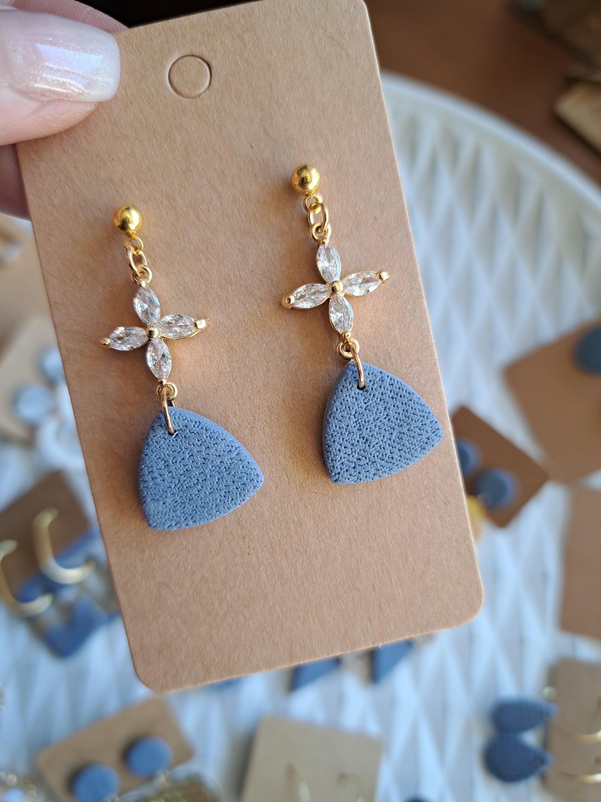 Polymerton ist eine ofenhärtende Modelliermasse die sich vor allem durch ihr leichtes Gewicht auszeichnet. Daher sind die Ohrringe sehr angenehm zu tragen und beschweren deine Ohren nicht. Nach dem Ausrollen und in Form bringen werden die Ohrringe gebacken und durchlaufen danach viele verschieden Arbeitsschritte. Einige Arbeitsschritte kannst du dir auch Hier ansehen. Manche Modelle werden nach dem Backen mit UV Harz versiegelt. Die Rückseiten der Ohrringe sind in der Regel nicht bearbeitet.