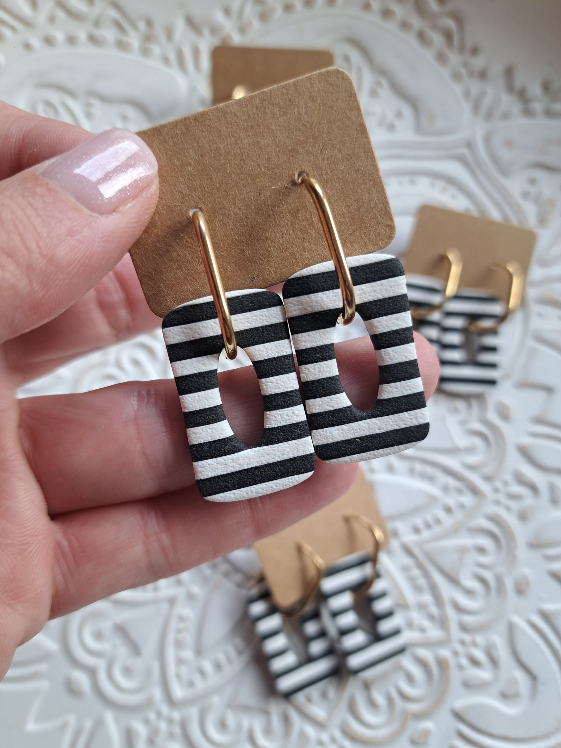 Polymerton ist eine ofenhärtende Modelliermasse die sich vor allem durch ihr leichtes Gewicht auszeichnet. Daher sind die Ohrringe sehr angenehm zu tragen und beschweren deine Ohren nicht. Nach dem Ausrollen und in Form bringen werden die Ohrringe gebacken und durchlaufen danach viele verschieden Arbeitsschritte. Einige Arbeitsschritte kannst du dir auch Hier ansehen. Manche Modelle werden nach dem Backen mit UV Harz versiegelt. Die Rückseiten der Ohrringe sind in der Regel nicht bearbeitet.