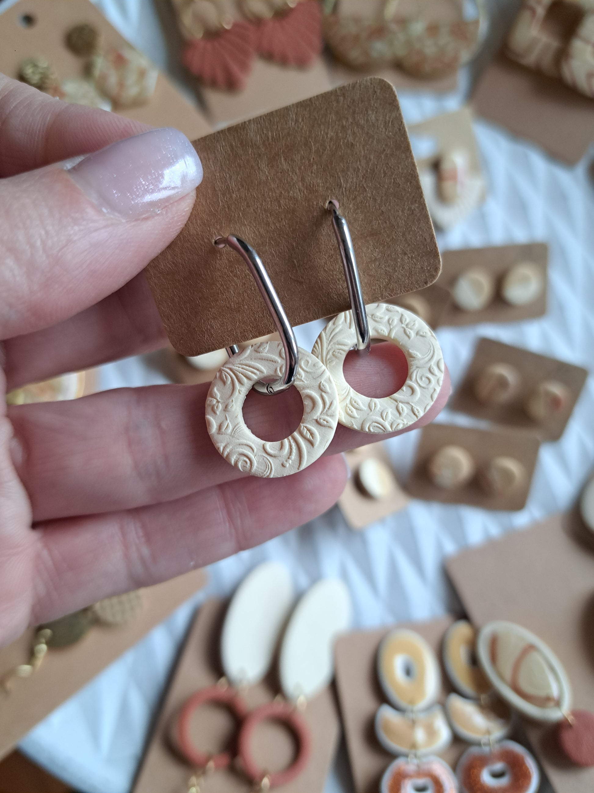 Polymerton ist eine ofenhärtende Modelliermasse die sich vor allem durch ihr leichtes Gewicht auszeichnet. Daher sind die Ohrringe sehr angenehm zu tragen und beschweren deine Ohren nicht. Nach dem Ausrollen und in Form bringen werden die Ohrringe gebacken und durchlaufen danach viele verschieden Arbeitsschritte. Einige Arbeitsschritte kannst du dir auch Hier ansehen. Manche Modelle werden nach dem Backen mit UV Harz versiegelt. Die Rückseiten der Ohrringe sind in der Regel nicht bearbeitet.