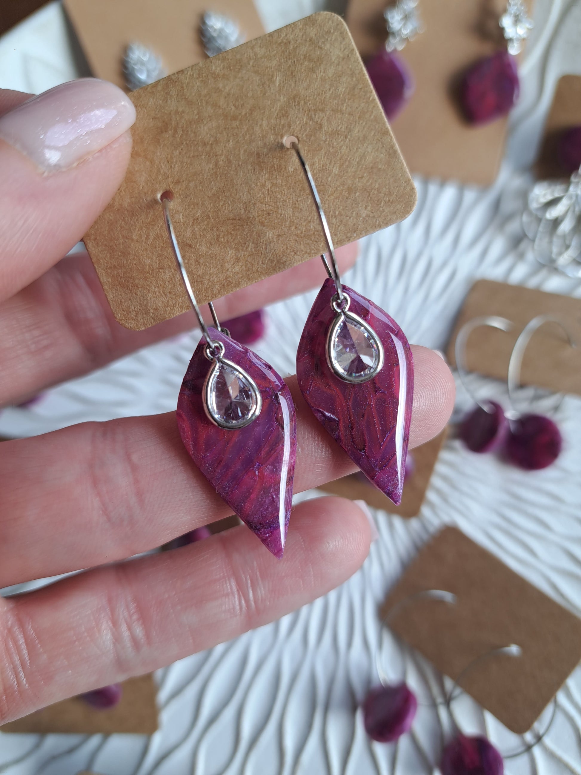 Polymerton ist eine ofenhärtende Modelliermasse die sich vor allem durch ihr leichtes Gewicht auszeichnet. Daher sind die Ohrringe sehr angenehm zu tragen und beschweren deine Ohren nicht. Nach dem Ausrollen und in Form bringen werden die Ohrringe gebacken und durchlaufen danach viele verschieden Arbeitsschritte. Einige Arbeitsschritte kannst du dir auch Hier ansehen. Manche Modelle werden nach dem Backen mit UV Harz versiegelt. Die Rückseiten der Ohrringe sind in der Regel nicht bearbeitet.
