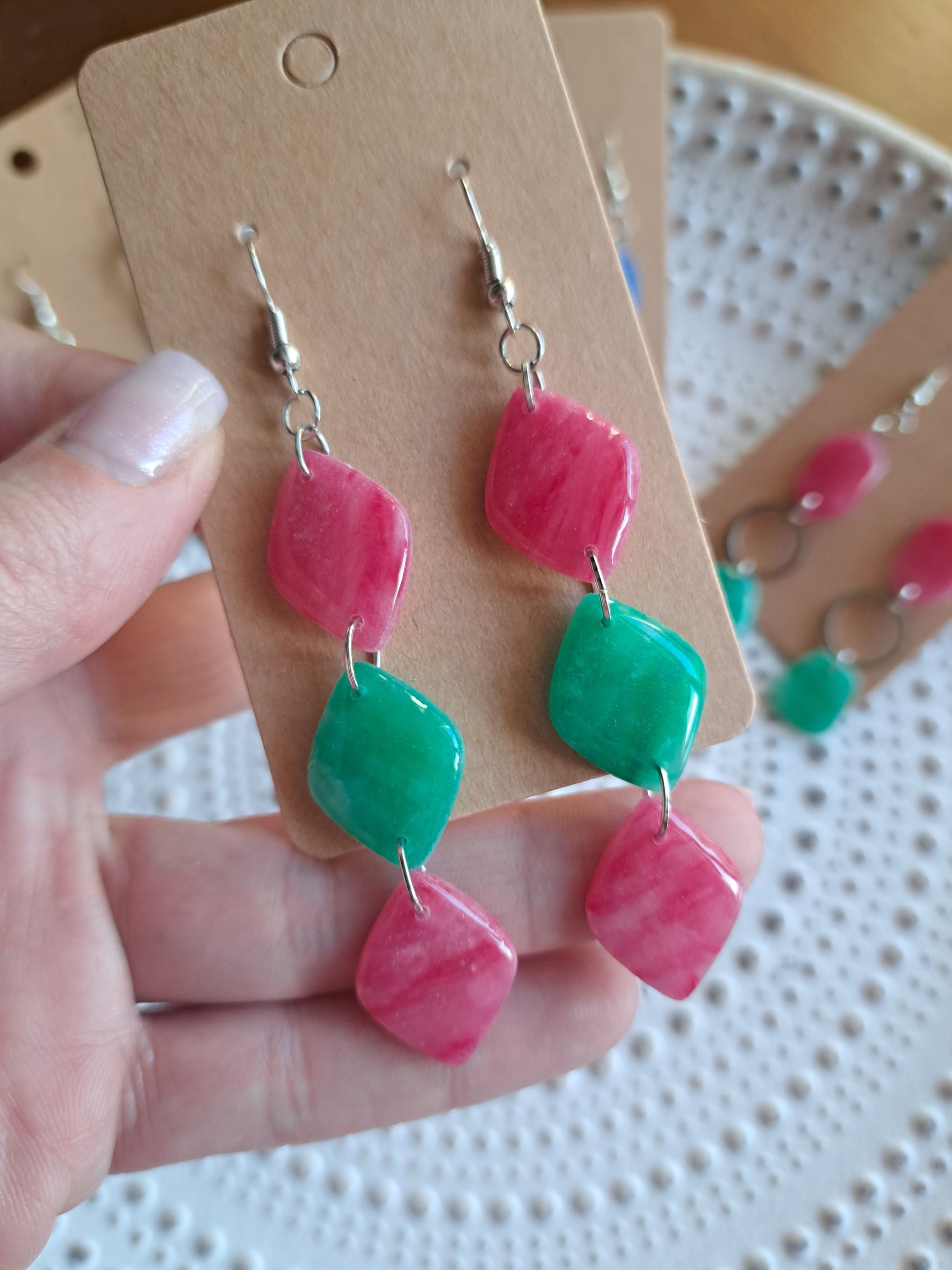 Polymerton ist eine ofenhärtende Modelliermasse die sich vor allem durch ihr leichtes Gewicht auszeichnet. Daher sind die Ohrringe sehr angenehm zu tragen und beschweren deine Ohren nicht. Nach dem Ausrollen und in Form bringen werden die Ohrringe gebacken und durchlaufen danach viele verschieden Arbeitsschritte. Einige Arbeitsschritte kannst du dir auch Hier ansehen. Manche Modelle werden nach dem Backen mit UV Harz versiegelt. Die Rückseiten der Ohrringe sind in der Regel nicht bearbeitet.
