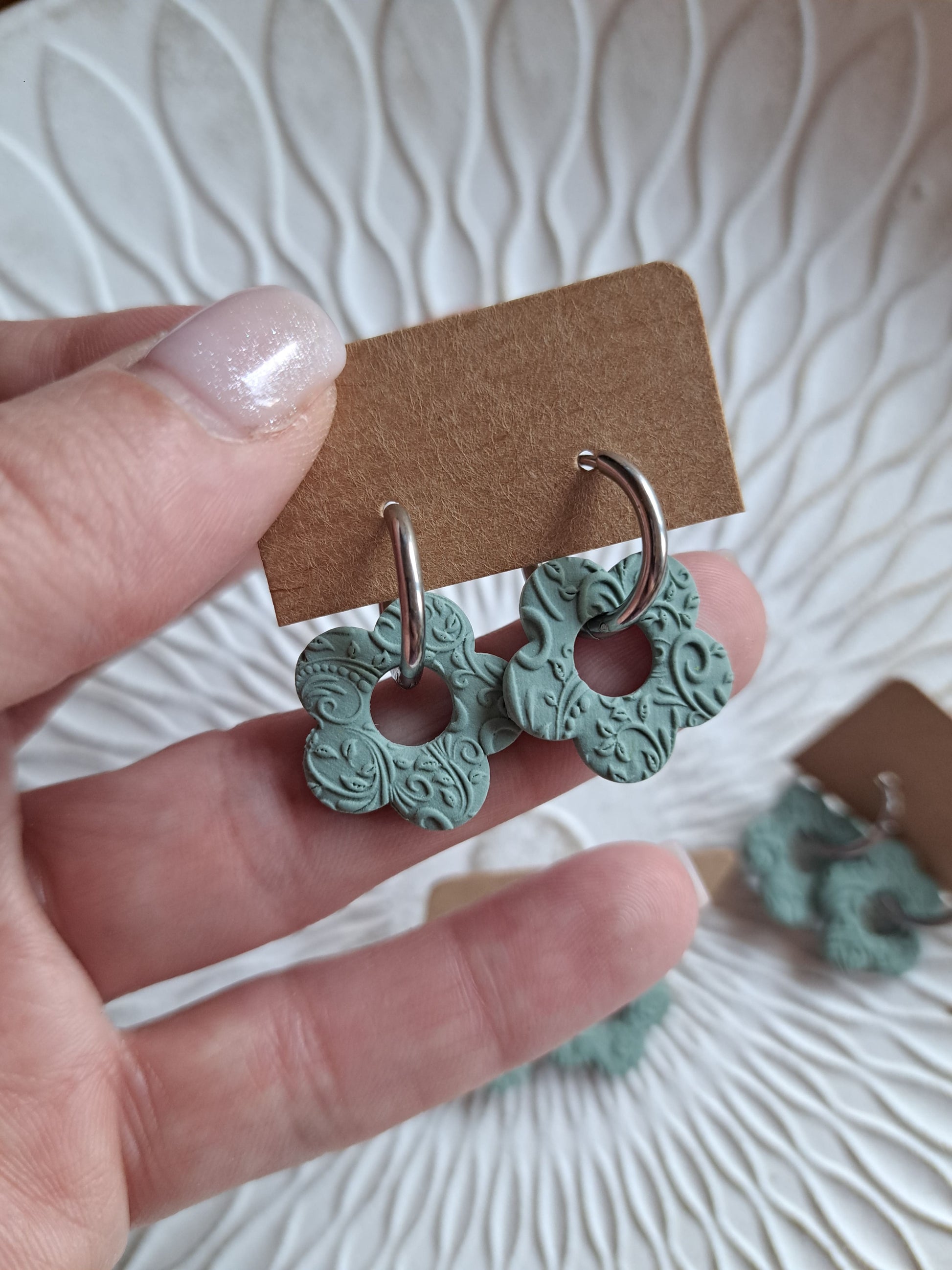 Polymerton ist eine ofenhärtende Modelliermasse die sich vor allem durch ihr leichtes Gewicht auszeichnet. Daher sind die Ohrringe sehr angenehm zu tragen und beschweren deine Ohren nicht. Nach dem Ausrollen und in Form bringen werden die Ohrringe gebacken und durchlaufen danach viele verschieden Arbeitsschritte. Einige Arbeitsschritte kannst du dir auch Hier ansehen. Manche Modelle werden nach dem Backen mit UV Harz versiegelt. Die Rückseiten der Ohrringe sind in der Regel nicht bearbeitet.