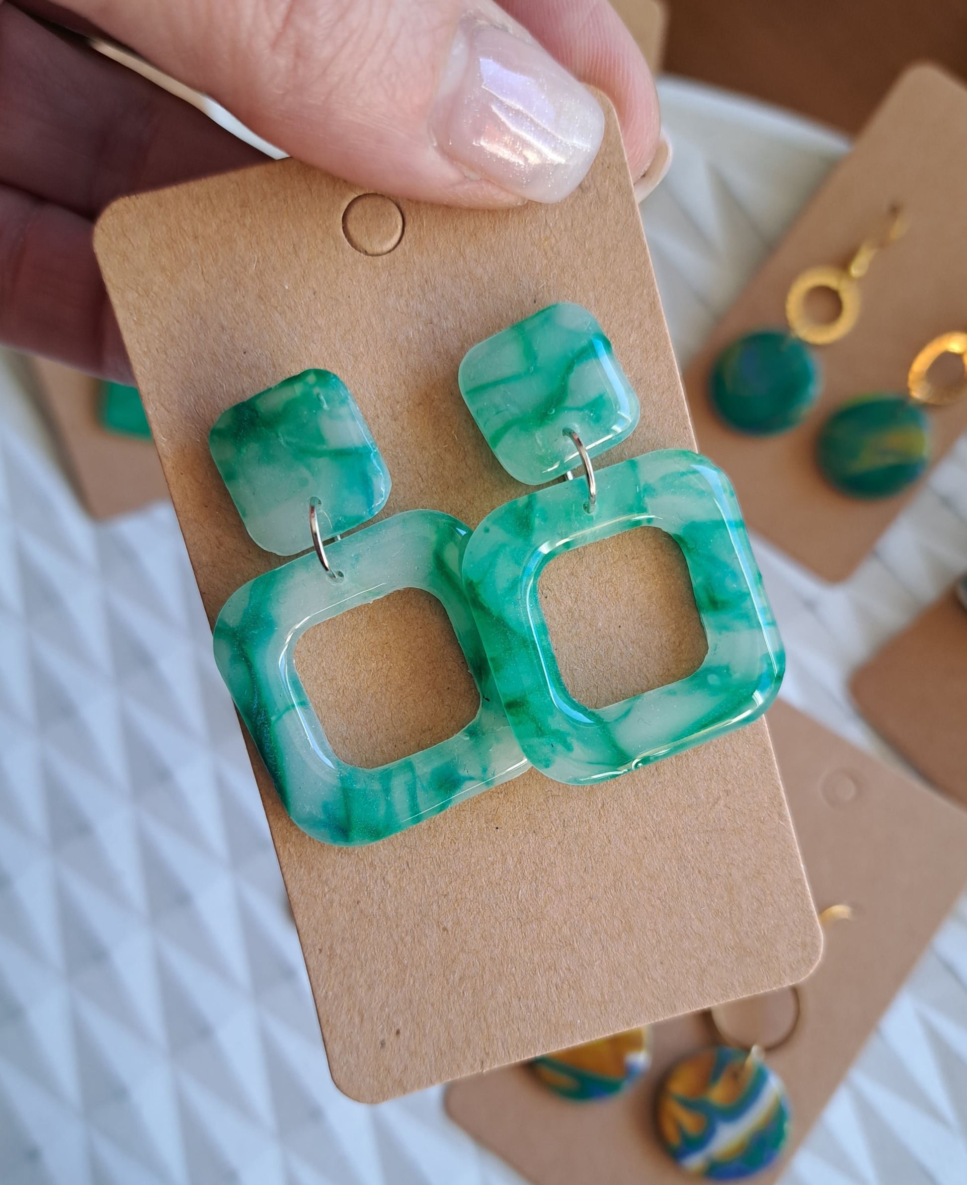 Polymerton ist eine ofenhärtende Modelliermasse die sich vor allem durch ihr leichtes Gewicht auszeichnet. Daher sind die Ohrringe sehr angenehm zu tragen und beschweren deine Ohren nicht. Nach dem Ausrollen und in Form bringen werden die Ohrringe gebacken und durchlaufen danach viele verschieden Arbeitsschritte. Einige Arbeitsschritte kannst du dir auch Hier ansehen. Manche Modelle werden nach dem Backen mit UV Harz versiegelt. Die Rückseiten der Ohrringe sind in der Regel nicht bearbeitet.