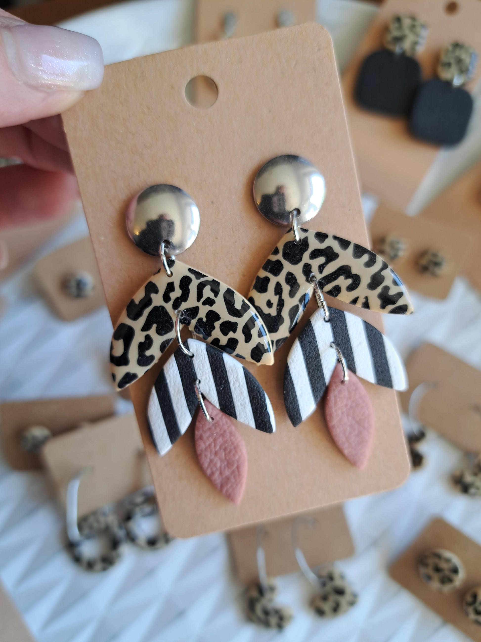 Polymerton ist eine ofenhärtende Modelliermasse die sich vor allem durch ihr leichtes Gewicht auszeichnet. Daher sind die Ohrringe sehr angenehm zu tragen und beschweren deine Ohren nicht. Nach dem Ausrollen und in Form bringen werden die Ohrringe gebacken und durchlaufen danach viele verschieden Arbeitsschritte. Einige Arbeitsschritte kannst du dir auch Hier ansehen. Manche Modelle werden nach dem Backen mit UV Harz versiegelt. Die Rückseiten der Ohrringe sind in der Regel nicht bearbeitet.