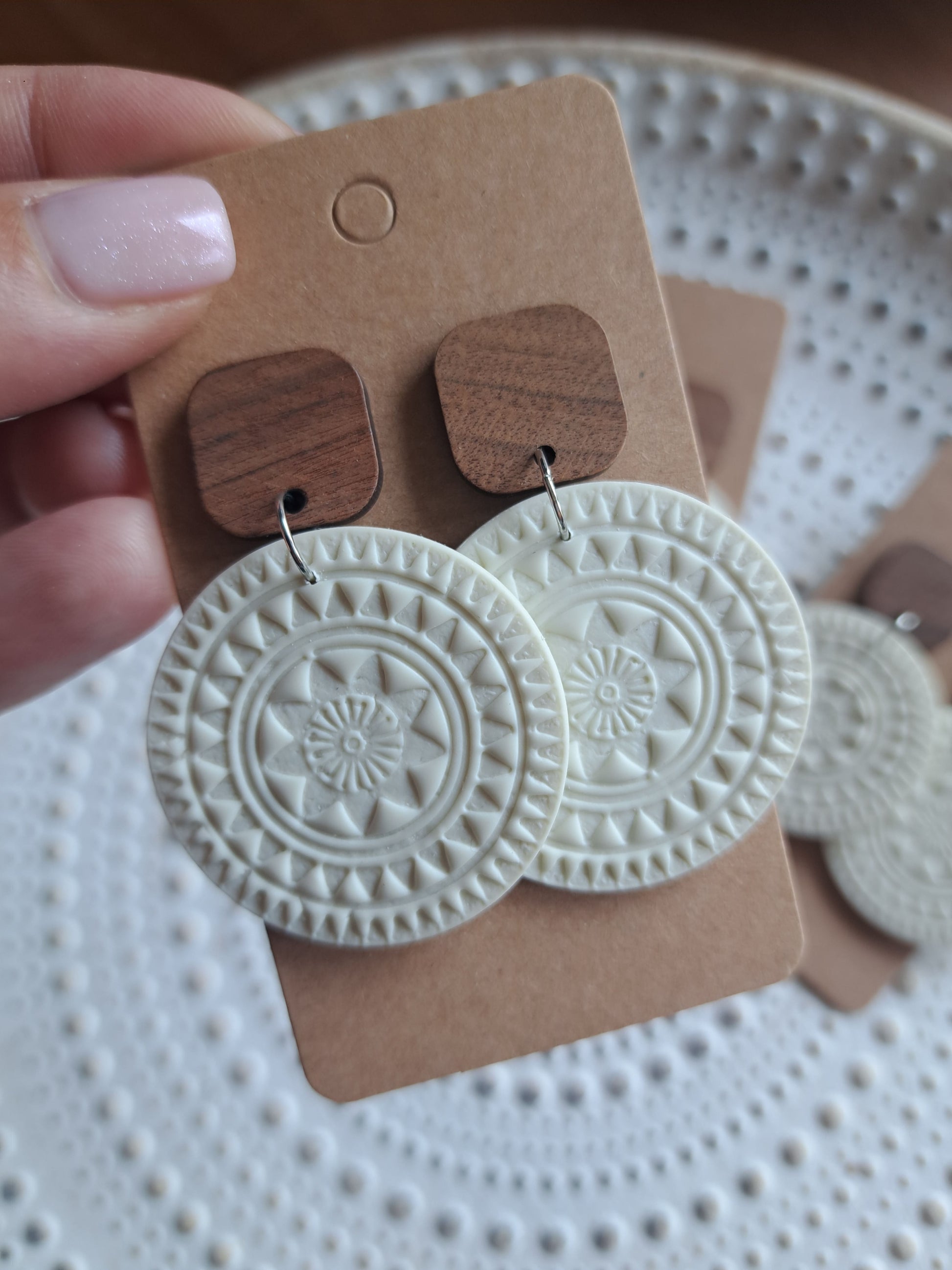 Polymerton ist eine ofenhärtende Modelliermasse die sich vor allem durch ihr leichtes Gewicht auszeichnet. Daher sind die Ohrringe sehr angenehm zu tragen und beschweren deine Ohren nicht. Nach dem Ausrollen und in Form bringen werden die Ohrringe gebacken und durchlaufen danach viele verschieden Arbeitsschritte. Einige Arbeitsschritte kannst du dir auch Hier ansehen. Manche Modelle werden nach dem Backen mit UV Harz versiegelt. Die Rückseiten der Ohrringe sind in der Regel nicht bearbeitet.