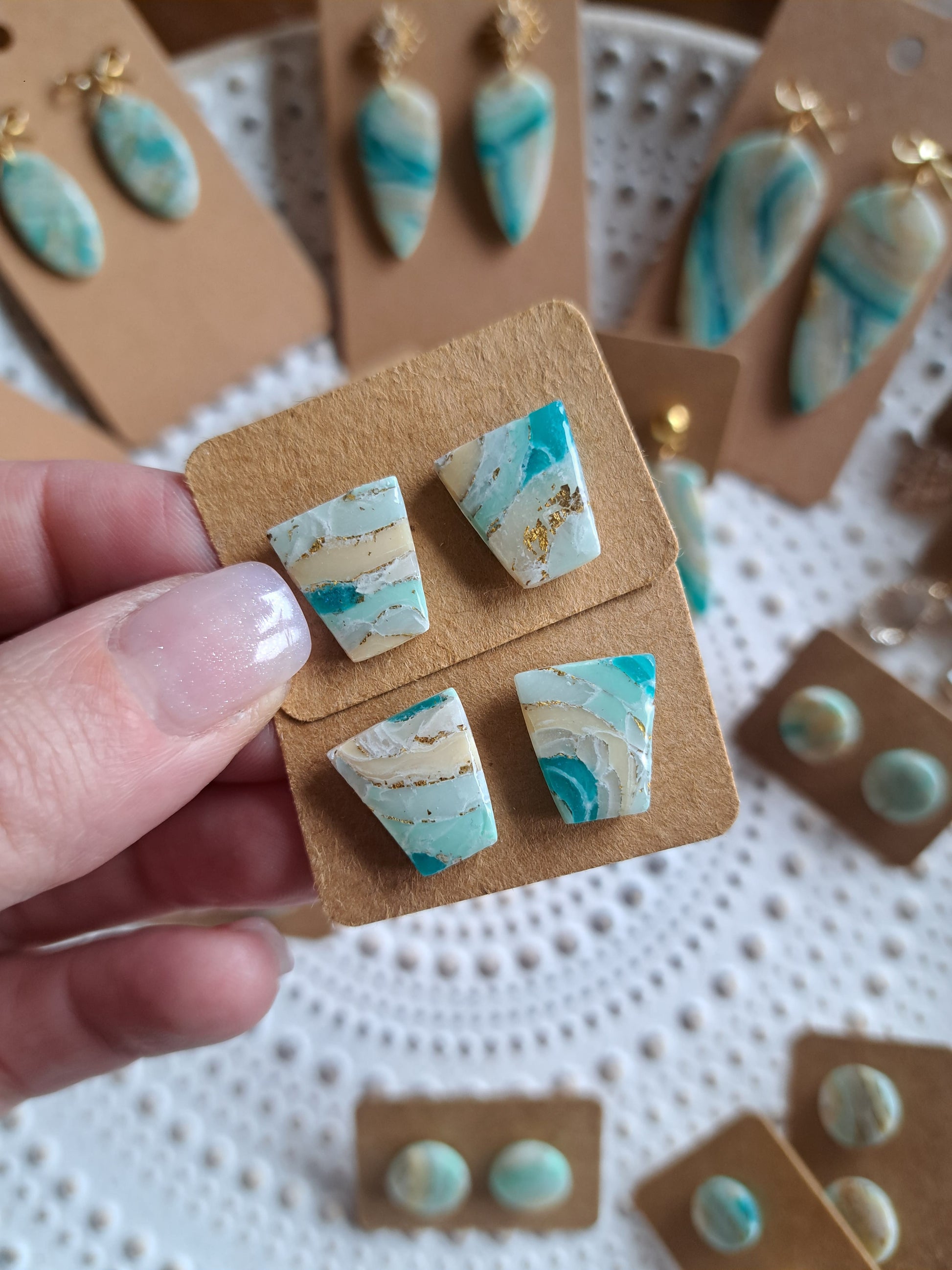 Polymerton ist eine ofenhärtende Modelliermasse die sich vor allem durch ihr leichtes Gewicht auszeichnet. Daher sind die Ohrringe sehr angenehm zu tragen und beschweren deine Ohren nicht. Nach dem Ausrollen und in Form bringen werden die Ohrringe gebacken und durchlaufen danach viele verschieden Arbeitsschritte. Einige Arbeitsschritte kannst du dir auch Hier ansehen. Manche Modelle werden nach dem Backen mit UV Harz versiegelt. Die Rückseiten der Ohrringe sind in der Regel nicht bearbeitet.